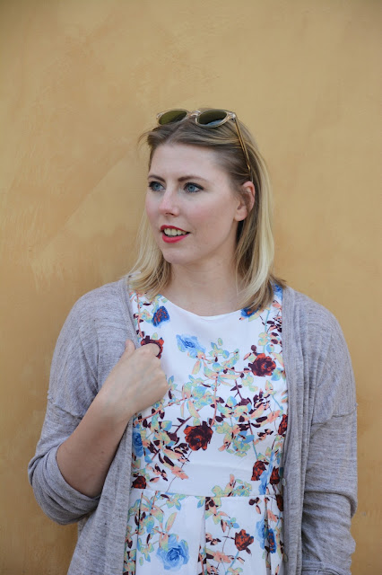 Der Look, bestehend aus meinem sommerlichen Kleid mit floralem Print und meinem gern getragenen Cardigan aus leichtem Stoff. Er ist der perfekte Begleiter für den Sommer – angenehm und nicht zu warm. Das Kleid entdeckte ich einige Wochen zuvor bei Limango im Outlet und ich konnte einfach nicht anders, es landete sofort in meinem Warenkorb. Für Mimi wurden auch gleich noch mehrere Kleider geordert – von Steiff. Sie waren aber auch einfach zu süß.